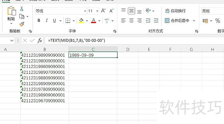 在C2单元格输入公式=TEXT(MID(B1,7,8),00-00-00),按回车确认。其中MID(B1,7,8)表示从B1单元格的第7个字符开始,提取长度为8的字符串,并通过TEXT函数将其格式化为00-00-00样式。