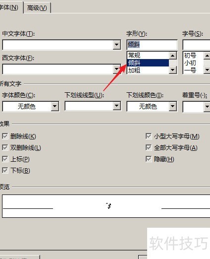 在打开的窗口中,点击字形的倾斜选项,其余保持不变。