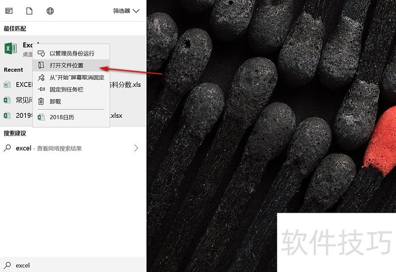 输入excel后,系统会自动匹配到Excel应用程序。将鼠标移至该位置,右键单击,在弹出的菜单中选择打开文件所在位置。