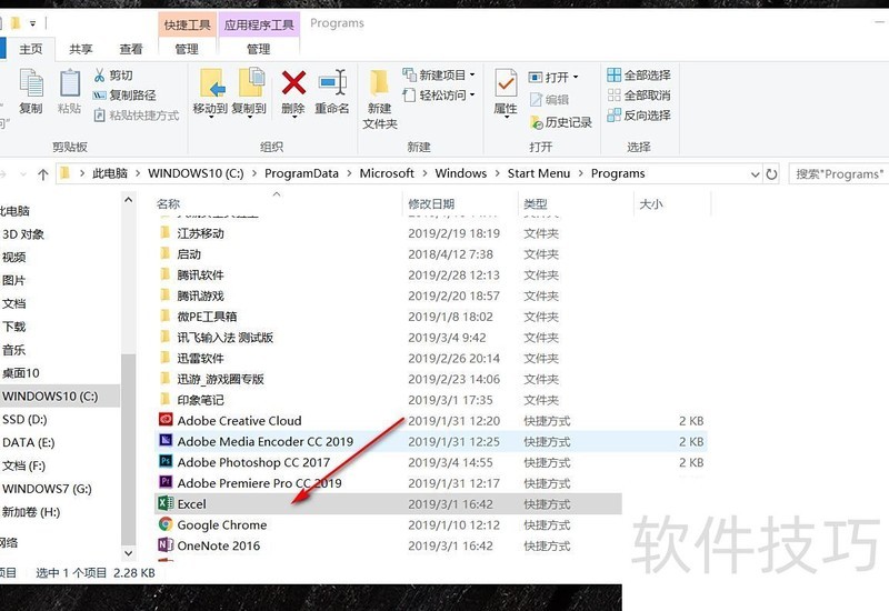 随后会弹出一个文件夹窗口,其中存放着Office Excel的快捷方式。选中该快捷方式,右键点击,并在弹出的菜单中选择打开文件所在位置。