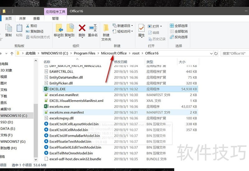 新跳转的文件夹中包含Office套件的Excel程序,地址栏明确显示了Microsoft Office的安装路径。