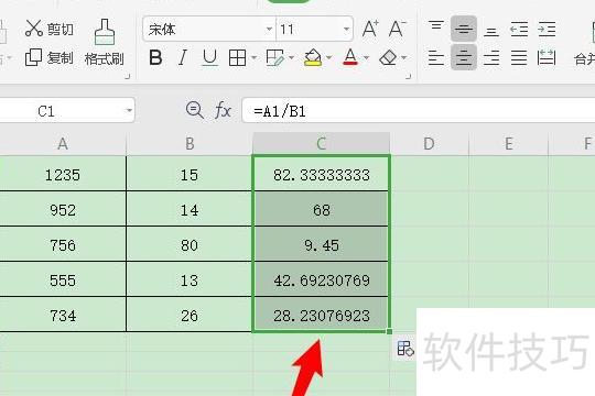 在C1单元格中输入公式:=A1/B1,进行除法运算。