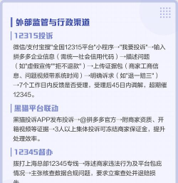 3、向监管部门,寻求外部帮助如果对平台的处理结果不满意,或者问题比较严重,比如涉及金额较大、假货泛滥等,可以考虑向外部监管部门举报。你可以拨打消费者投诉热线12315,或者通过“全国12315平台”网站、APP、小程序进行线上投诉。在投诉时,同样需要提交详细的证据材料,并写明被投诉商家的准确名称,以及拼多多平台的主体公司信息。市场监管部门会依法进行调查处理,这能给商家和平台带来更大的约束力,是维护权益的有力后盾。