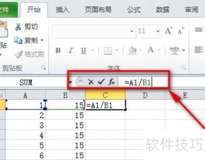 在编辑栏输入公式,表示将A列单元格的数值除以B列对应单元格的数值。