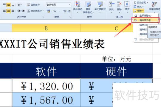 在下拉菜单中选择清除格式命令,可清除单元格中文本的字体、字号、颜色、样式及对齐方式、数字格式等所有格式设置,恢复为默认状态。