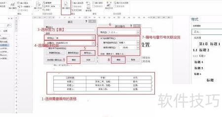 2所示,先点击表格左上角的四向箭头全选表格,接着选择引用选项卡中的插入题注。在弹出的题注设置窗口中,将标签设为,位置选择。然后点击编号按钮,在编号格式中选择,勾选包含章节号,章节起始样式设为,使用分隔符选择。最后依次点击确定按钮完成题注编号和题注设置操作。