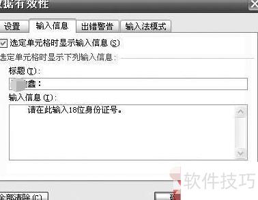 选中需设置提示的单元格,点击数据菜单中的有效性,打开数据有效性对话框。切换至输入信息选项卡,勾选选定单元格时显示输入信息,在标题和内容栏中输入相应文字(2所示),点击确定完成设置。此后,当选中该单元格时,系统将自动显示设定的提示信息。