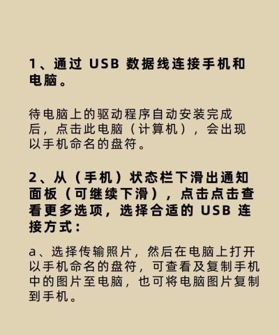 3、选择合适的USB连接模式用数据线连接手机和电脑后,手机通知栏会有提示,你需要下拉通知栏,点击USB连接方式,通常,会有几个选项,比如“仅充电”、“传输文件”、“传输照片”,如果你想传文件,就选择“传输文件”,这样,电脑就能识别你的手机了。