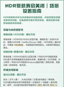 1、hdr开启前的准备工作你得确认设备支持,不是所有设备,都能开启hdr功能,检查你的显示器,或者电视,是否标有hdr认证,比如hdr10,或者杜比视界,接着,确认信号源,你播放的内容,本身也得是hdr格式的,检查连接线,最好使用hdmi 2.0,或更高版本的线缆,这样才能传输,完整的hdr信号,做好这些准备,开启hdr就成功了一半。