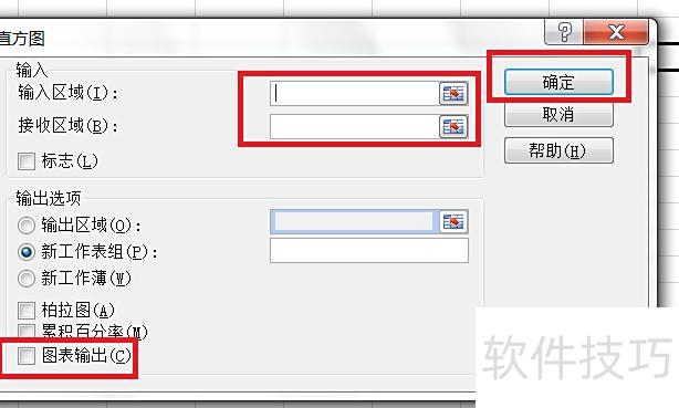 在直方图界面中,选定数据区域及结果存放位置,勾选图表输出选项,点击确定即可自动生成频数分析结果及对应的直方图。