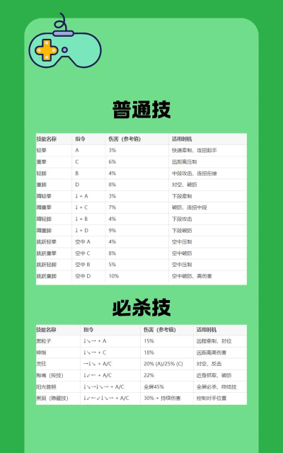 1、理解基础指令,这是第一步出招表看着复杂,其实有规律可循,大部分必杀技,都靠方向键组合,加上拳脚键触发,比如“下前拳”,就是经典指令,先摇杆拉下,然后快速推前,同时按下拳键,多练习几次,手感自然就来。