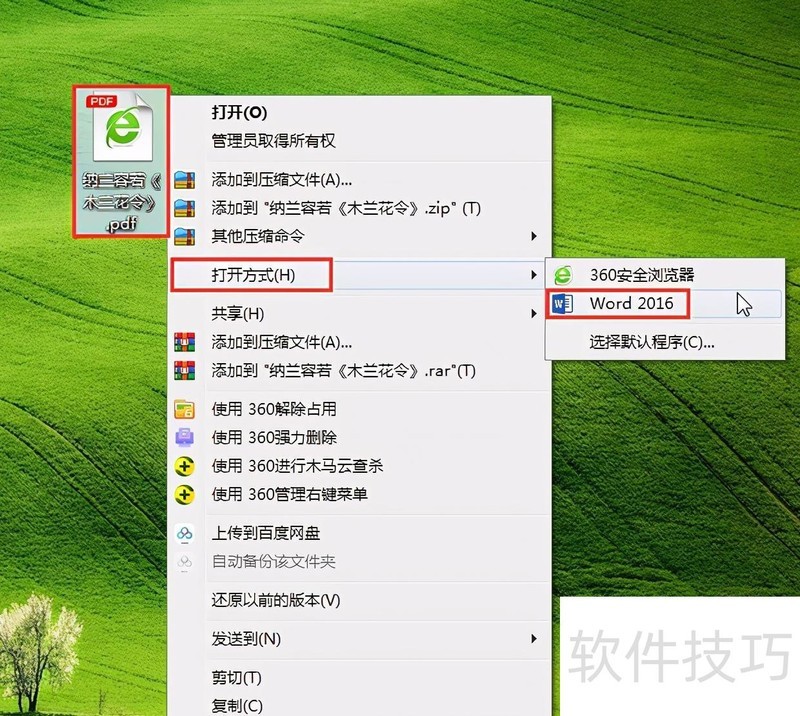选中需转换的PDF文件,右键点击,选择打开方式,然后在下级菜单中选取Word程序(本例为Word2016),即可将PDF文件以Word格式打开编辑。