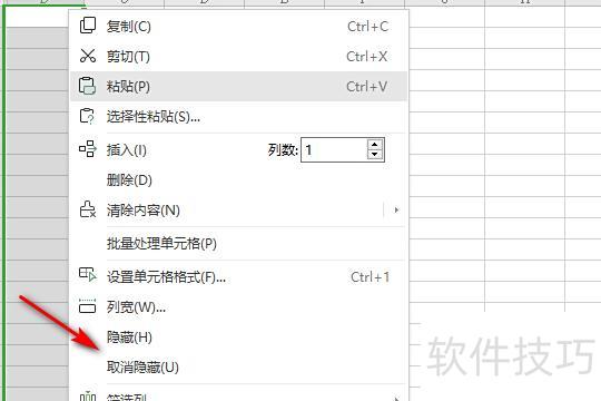 隐藏完成后,选中另一列,右键点击,在弹出菜单中选择取消隐藏即可。