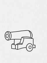 从炮管开始画,画一条长长的直线,然后在两端加粗,形成圆筒感,接着画两个轮子,注意左右对称,最后加上炮架,连接炮管和轮子,轮廓就出来了。