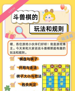 4、学习实战技巧与策略下棋要有策略,开局时,不要急着进攻,先保护好老鼠,因为老鼠能防狮虎过河,也能偷袭大象,中期要控制河道,用狮虎威胁对方,同时保护自己的陷阱,后期要果断进攻,瞄准对方兽穴,但别忘了防守,小心被偷袭,记住,配合很重要,用棋子互相保护,才能赢得胜利。