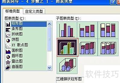 选择三维簇状柱形图等图表类型,点击下一步继续操作。