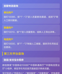 3、拨打客服热线查询当然,你也可以直接,拨打运营商的客服电话,中国移动的客服是10086,中国联通是10010,中国电信是10000,接通后,根据语音提示操作,通常按相应数字键,就能转到流量查询服务,或者,直接转接人工客服,让客服人员帮你查询,虽然步骤稍多,但非常可靠。
