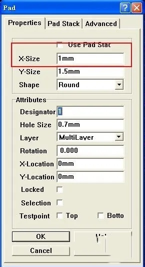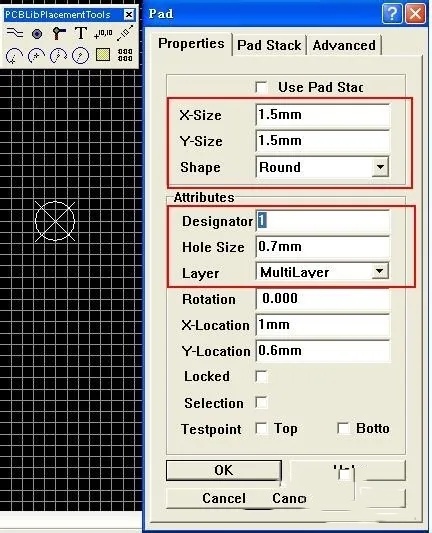 参考元件规格书,确定引脚直径(例如F=0.48mm)。孔径一般比引脚直径大0.2-0.4mm。这里选择0.22mm。焊盘直径通常比孔径大0.5-0.8mm。这里设置为0.7mm,总直径为1.5mm。