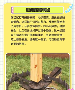 第一步,先观察环境,确保周围安全,没有其他人或宠物,第二步,戴上厚手套,用木棍轻轻压住,触发板的位置,注意,动作要稳,要慢,不要突然用力,第三步,当夹片微微张开时,迅速将撬棍,插入夹片根部,然后,慢慢向下压撬棍,让夹口持续张开,直到完全打开,用安全销或绳子,固定住打开的夹片,这样,它就暂时安全了。