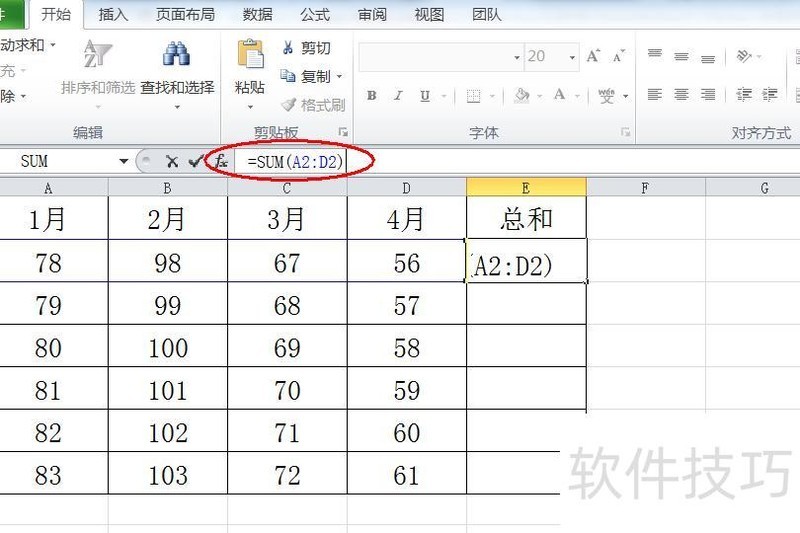 在Excel顶部功能区点击主页选项卡,接着在右侧编辑区域点击自动求和图标即可完成操作。
