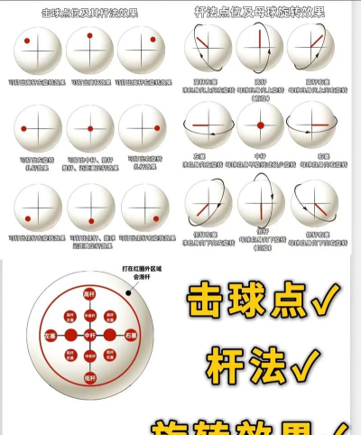 2、加塞的基本原理与击球点母球上有九个基本击球点,中心点叫中杆,不打旋转,中心往上叫高杆,会让球往前滚,中心往下叫低杆,会让球往回缩,这些是纵向的加塞,还有横向的,中心往左叫左塞,往右叫右塞,左塞让球逆时针旋转,右塞则顺时针旋转,通常,我们说的加塞,主要指左右塞,击球时,球杆要打准这些点,偏一点,效果就差很多。