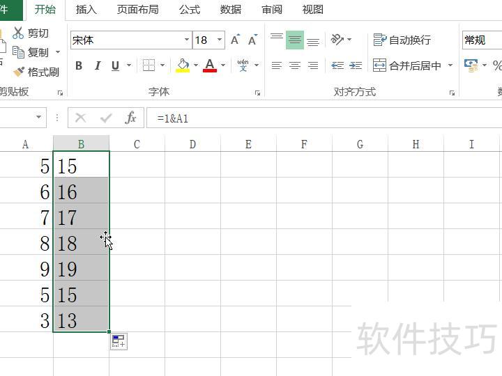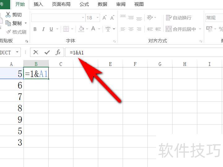 选中单元格B1,在公式栏输入=1&A1,将数字1统一添加到A1内容前。