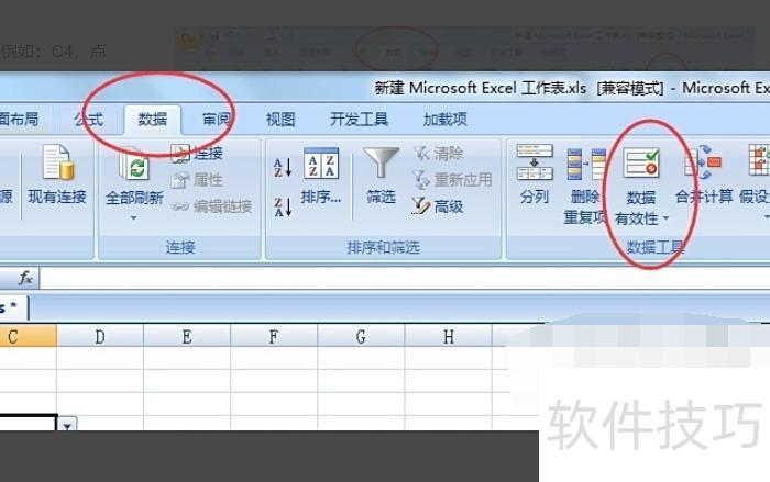 打开Excel,选中C4单元格,点击数据选项卡中的数据有效性功能。