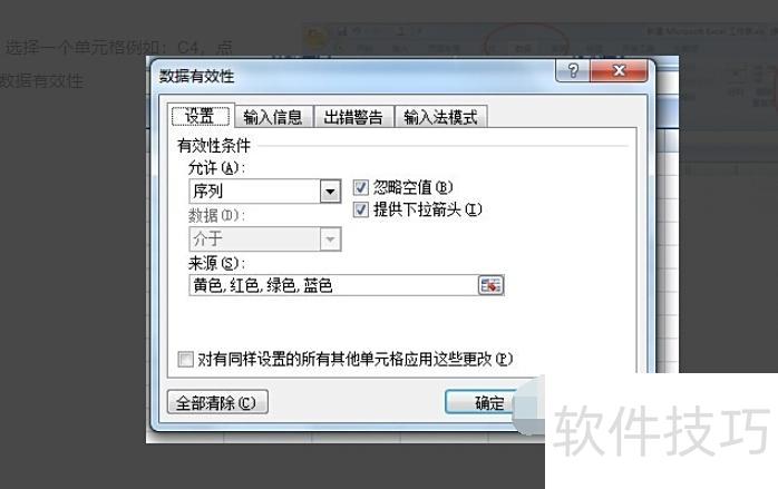 弹出窗口后,在允许下方选择序列,在来源栏输入选项内容,以英文小写逗号隔开,如:黄色,红色,绿色,蓝色。
