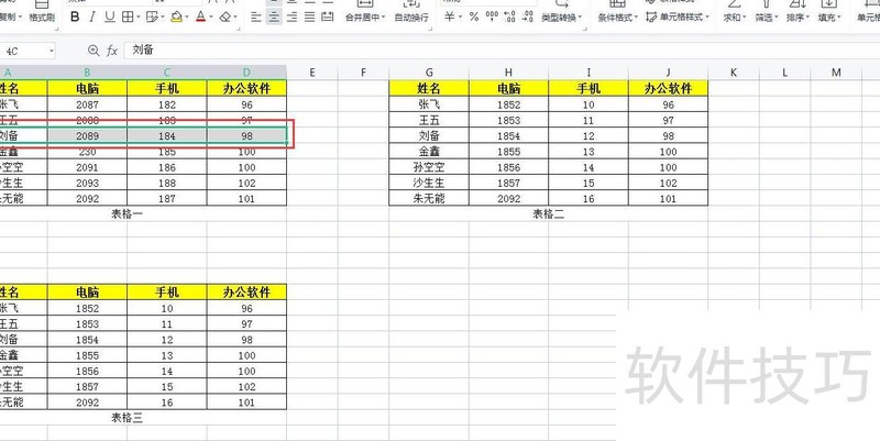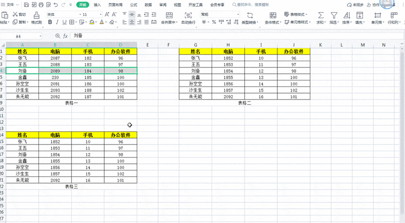 在第一个表格中,选择要插入新行的上一行。例如,若要在第四行刘备下方添加数据,先选中第四行,所示。