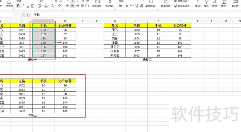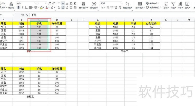 在第一个表格中,选择要插入新列的前一列。例如,若要在第三列手机后添加新列,先选中第三列,所示。