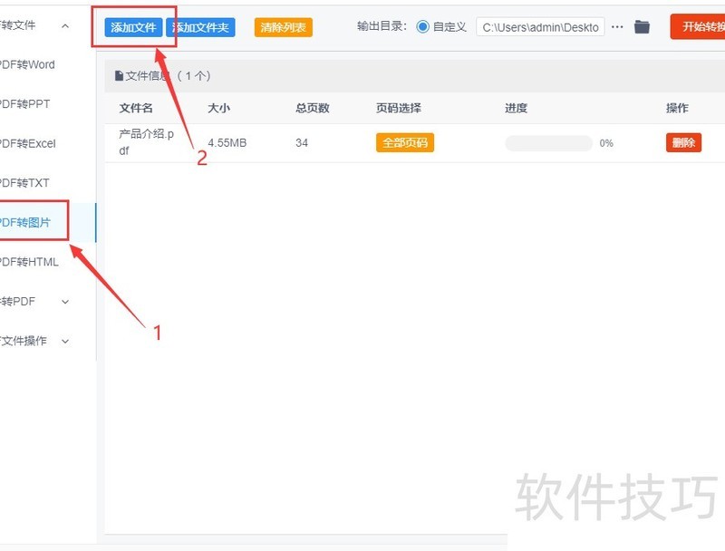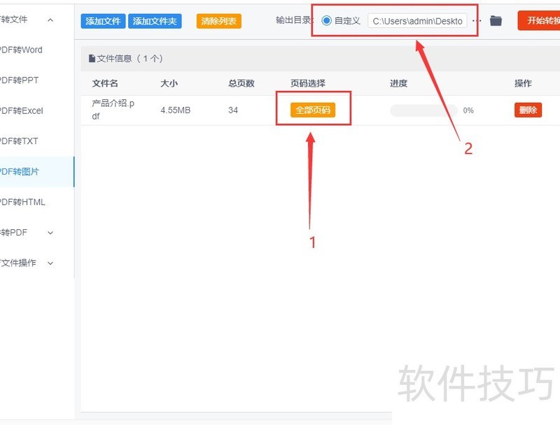 第三步,先选定需转换的页码,未选择时默认全部页面转为图片;再设置输出文件夹,用于保存生成的图片文件。
