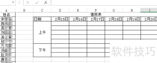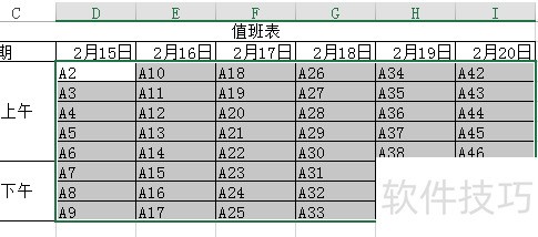 在A列列出所有值班人员,并在C1至I10区域内制作对应的值班表。