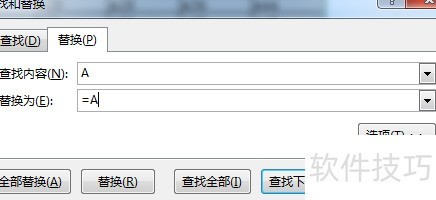 6.4 打开查找和替换对话框,于查找内容框内输入 A,在替换为框中输入=A,随后点击全部替换按钮完成操作。