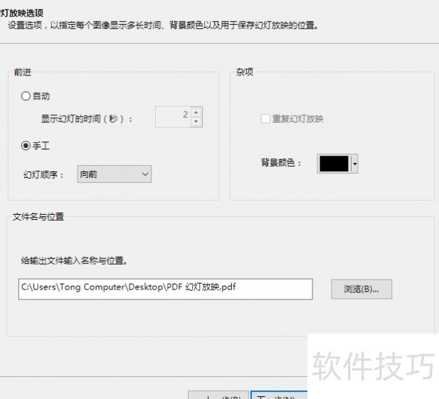 在选择图像界面中,通过添加和删除按钮调整图片列表内容,并使用左右双箭头按钮调整所选图片的排列顺序。完成图片排序后进入下一环节,为图片之间的切换设置转场效果。接着配置幻灯片播放方式,可选择自动播放或手动控制,并设定输出PDF幻灯片的保存路径及文件名(3所示)。最后点击下一步,系统将自动生成包含幻灯片效果的PDF文件,整个创建过程简便高效,无需复杂操作即可完成。