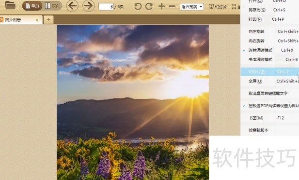 可通过极速PDF阅读器的幻灯片模式实现播放。点击软件右上角倒三角设置按钮,或直接按下Ctrl+L快捷键,在高版本中也可点击工具栏对应图标(图5),即可进入幻灯放映状态。文档全屏展示,单击鼠标切换至下一页,通过右键菜单可进行播放控制与页面跳转操作,方便快捷地浏览PDF内容。