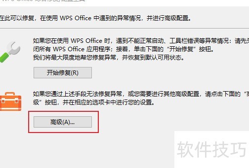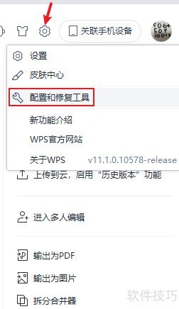 打开WPS,点击右上角齿轮图标,进入配置与修复工具选项。