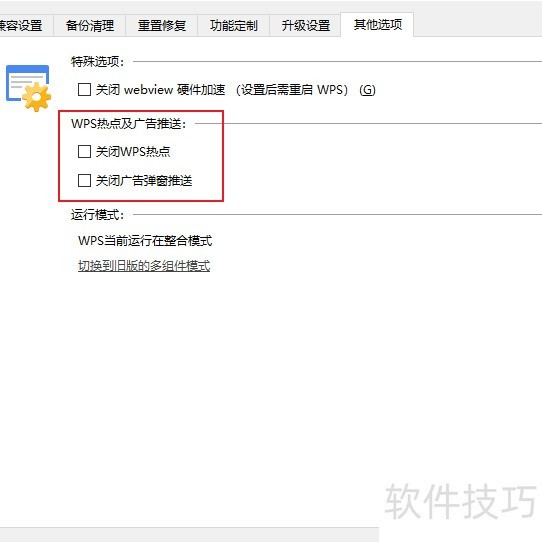 在弹出窗口中可设置关闭WPS热点及广告推送。