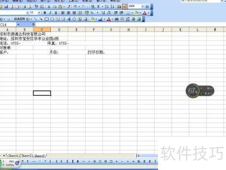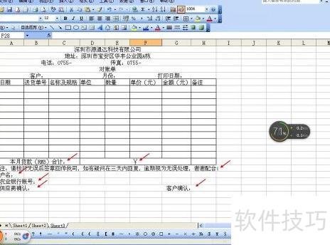 打开Excel表格,在第一行输入公司名称,第二行填写详细地址,第三行录入电话与传真信息,第四行输入对账单,第五行依次输入客户名称、月份及打印日期,格式所示。