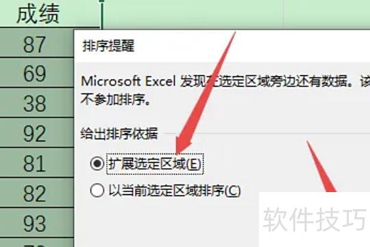 选择扩展选定区域,点击排序即可按成绩由高到低排列,实现名次顺序排列。