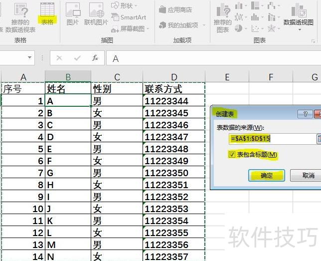 在创建表对话框中,系统自动选中当前数据区域,并根据是否存在标题行默认勾选表包含标题,点击确定即可完成建表。
