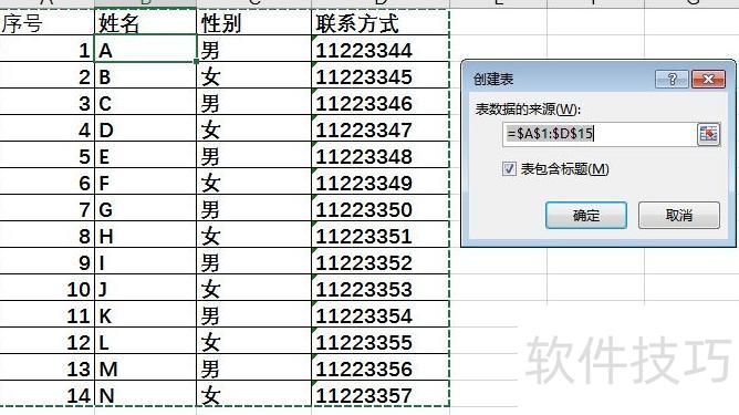 在创建表对话框中,系统自动选中当前数据区域,并依据是否存在标题默认勾选表包含标题,点击确定即可完成建表。