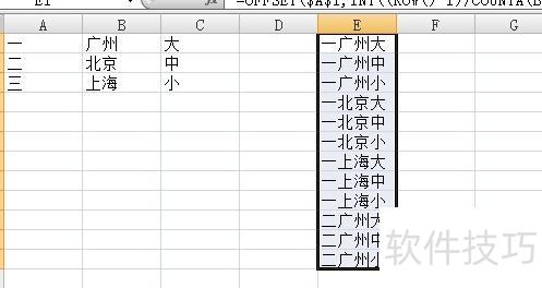假设数据分别位于A、B、C三列中,在E1单元格中输入如下公式:=OFFSET($A$1,INT((ROW()-1)/COUNTA(B:B)/COUNTA(C:C)),)&OFFSET($B$1,MOD(INT((ROW()-1)/COUNTA(C:C)),COUNTA(B:B)),)&OFFSET($C$1,MOD((ROW()-1),COUNTA(C:C)),)。该公式通过结合OFFSET函数与ROW、COUNTA、INT、MOD等函数,实现对三列数据的逐项交叉组合。利用行号变化动态计算每个组合对应的位置,从而按序提取A列、B列和C列中的元素,并将其连接成一个连续的结果序列,适用于生成多列数据的全排列组合。