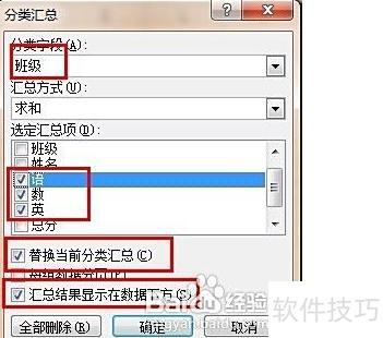 在分类汇总对话框中,选择班级作为分类字段,并勾选语文、数学、英语三列作为汇总项,具体操作所示。