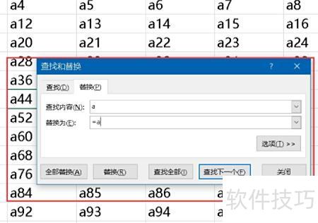 按CTRL+F打开替换功能,查找a并替换为=a,执行全部替换操作。