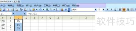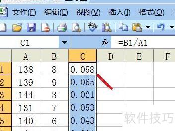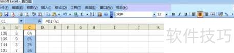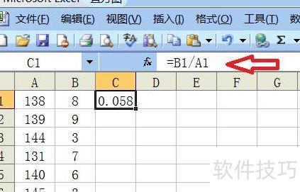 在函数栏输入=B1/A1,按回车键即可得出第一行的计算结果。