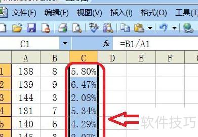 选中计算结果,点击Excel中的百分比按钮,即可将其转换为百分比格式,所示。