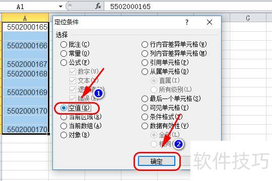 在定位条件中选择空值,点击确定即可。