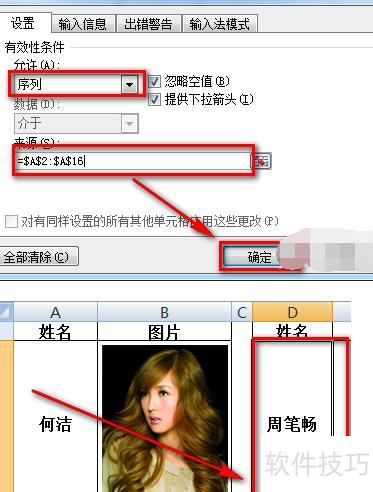 选择,在数据来源中选取A列数据,设置完成后,D2单元格将生成A列数据的下拉菜单,可从中选择不同名称。