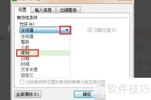 在数据有效性对话框中,单击任何值旁的下拉箭头,选择序列选项。