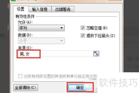 在来源下方的输入框中,填入需添加的选项,各选项间用英文小写逗号分隔,完成后点击确定。